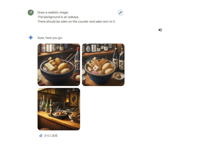 例えば次のような指示をプロンプトに出します。「写実的な画像を描画します。背景は居酒屋です。カウンターの上におでんがあり、その横に日本酒を置いてください。」これを英語に翻訳します。2024年8月現在日本語での画像生成機能には対応しておらず、日本語で指示を出しても画像は出てきません。