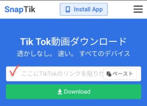 次に、SnapTikのサイトにアクセスします。このような画面が出てくるので、赤チェックがついているところに先ほどコピーしたURLを張り付け、「Download」ボタンを押し、SnapTikに動画を読み込ませます。