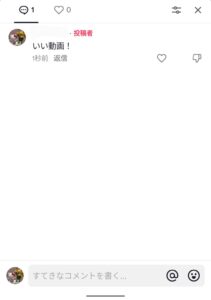 いいねボタンの下にコメントボタンがあります。コメントボタンを押すと画像のような画面が出てきます。ユーザーはこのコメント欄で動画の感想を他ユーザーと交流することができます。また、投稿者自身もコメントすることが可能です。
