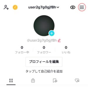 プロフィール画面では、自分がフォローしたユーザーの数や、自分のフォロワー、いいねを受け取った数を確認することができます。また、自分のアカウントを非公開に設定することも可能です。赤マルで囲われたボタンをタップしてみましょう。