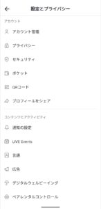 タップするとこのような設定画面が表示されます。プライバシーの所をタップすると非公開アカウントに切り替えることができます。またこの設定画面ではその他の設定も行えます。