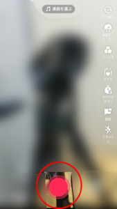 次にこのような画面に移ります。動画を撮影するときは赤マルで囲われた「撮影ボタン」をタップすることで動画が撮影されます。もう一度タップすると撮影が一時停止されます。上にある「楽曲を選ぶ」ボタンで楽曲をBGMとして動画で使用することが可能です。また、右にあるフィルターやメイクを使うことで動画に加工を施すこともできます。