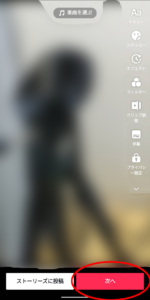 この画面では動画に文字を挿入したり、再度フィルターを施すといった編集を行うことができます。またBGMも再度設定することが可能です。動画の編集が完了したら赤マルで囲われた「次へ」ボタンを押しましょう。