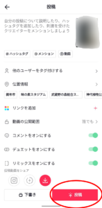 この画面では、動画の説明だけでなく公開範囲といった動画に関する詳細な設定を行うことができます。設定が終わったら、赤マルで囲われた「投稿」ボタンを押すことで投稿が完了されます。